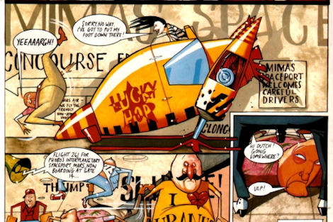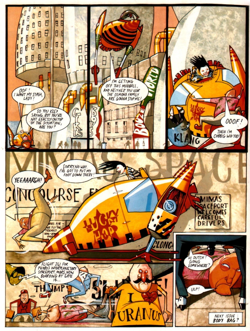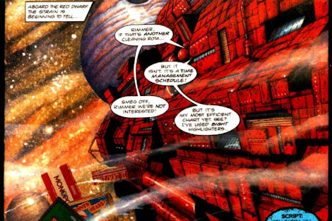 Some of the strips became increasingly surreal and esoteric - the unconventional art style of David Lyttleton made series like Mimas Crossing, which was based on concepts and characters from the Red Dwarf novels (including none other than Trixie laBouche), stand out, while there was particularly silly humour at play in Cred Dwarf, which followed the adventures of the alternate crew from "Back to Reality".