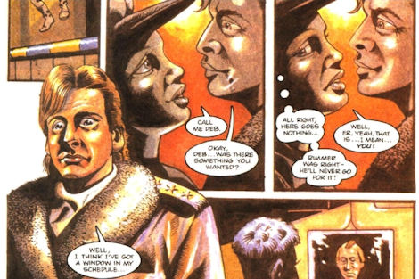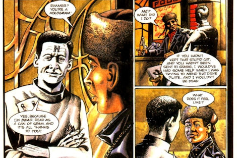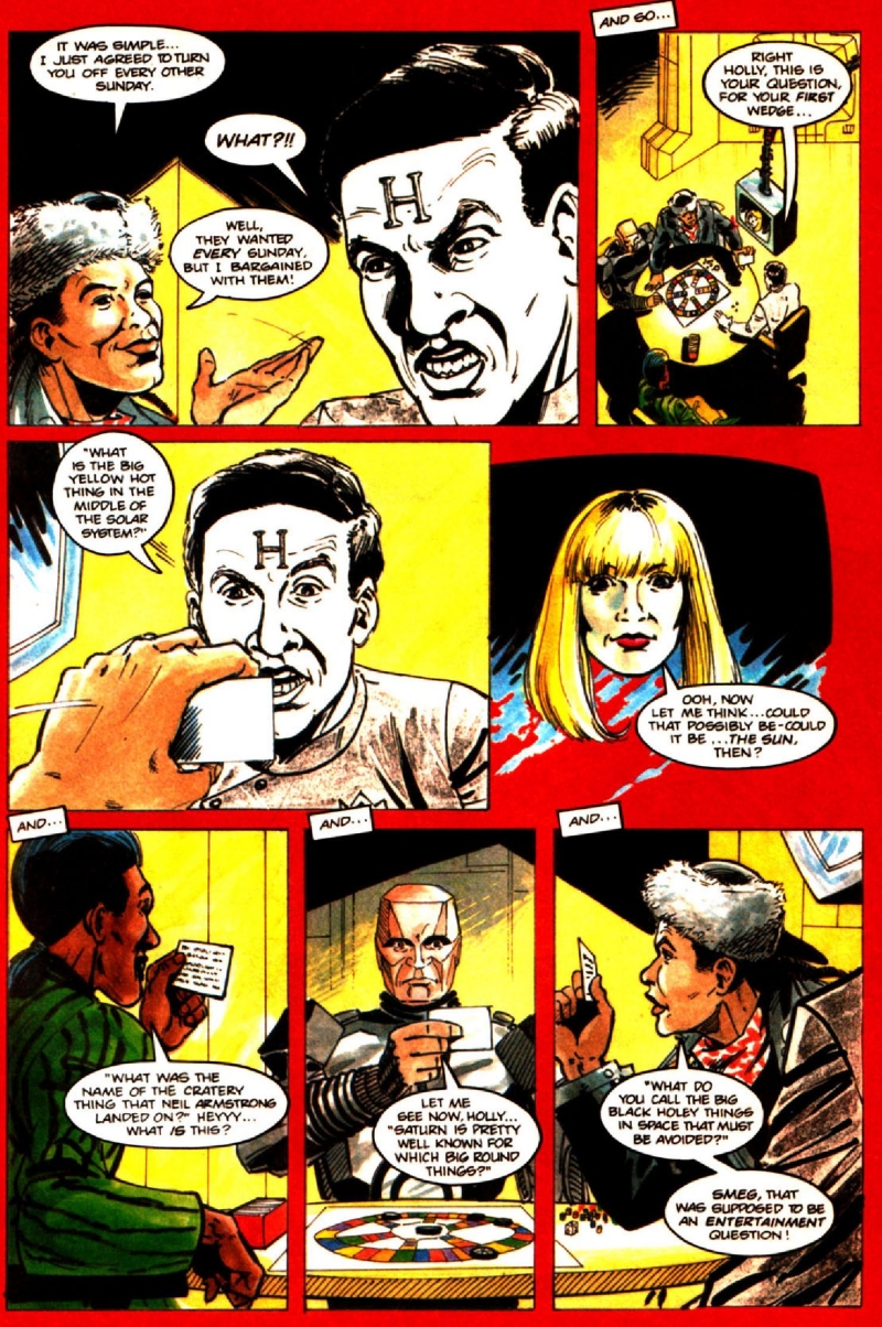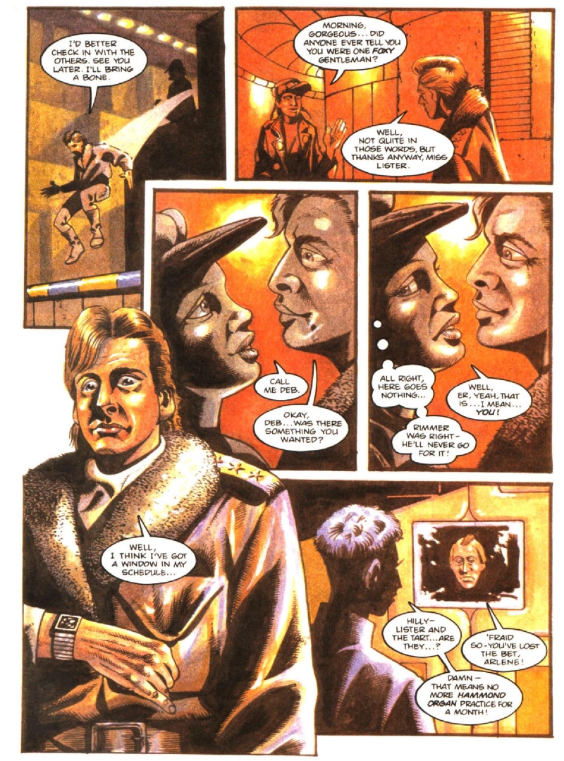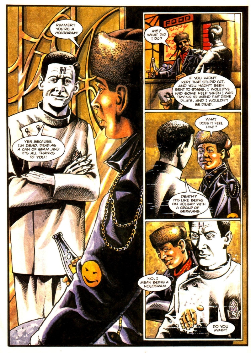 The comics also famously introduced a visual indicator for holograms that had actually originally been in Rob and Doug's minds when producing the series - but which cost had rendered prohibitive - by rendering McIntyre and later Rimmer in black-and-white rather than full colour. This was a design choice that would persist through all the strips published across the magazine's life.