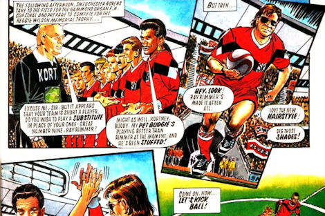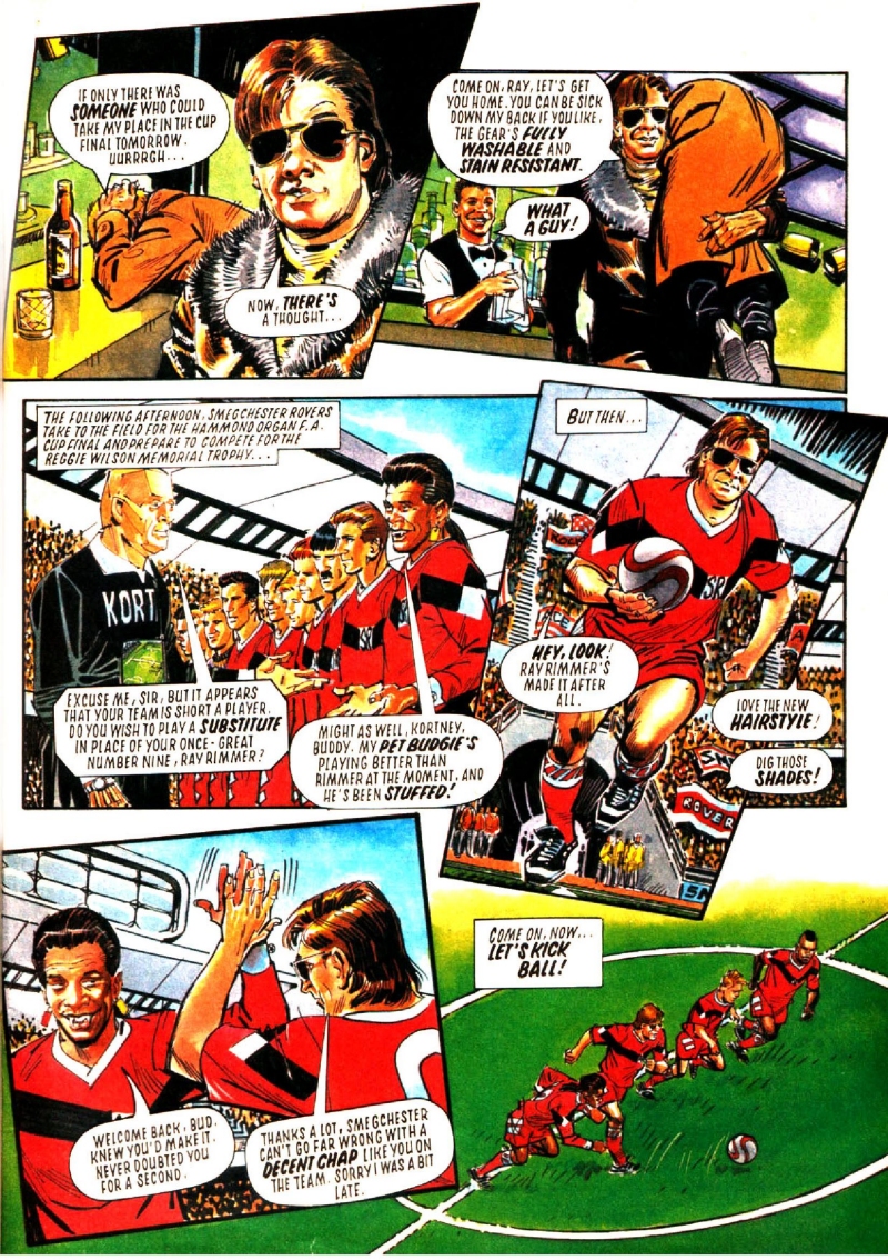 But it wasn't just straight Red Dwarf stories that the magazine would give page space to, and as the months drew on an array of spinoff strips began to run. The first of these was Ace Rimmer: Space Adventurer in issue #5, where Steve Lyons kicked off an occasional series by having Ace visit the parallel universe from, erm, "Parallel Universe", leading to the aforementioned dalliance with the female Lister. Ace's appearances were sporadic after that, but a particular highlight came in issue #7, when a Roy of the Rovers-esque parody strip was actually drawn by Barrie Mitchell, the ROTR artist of the time.