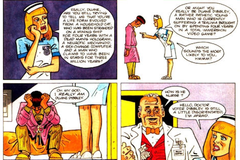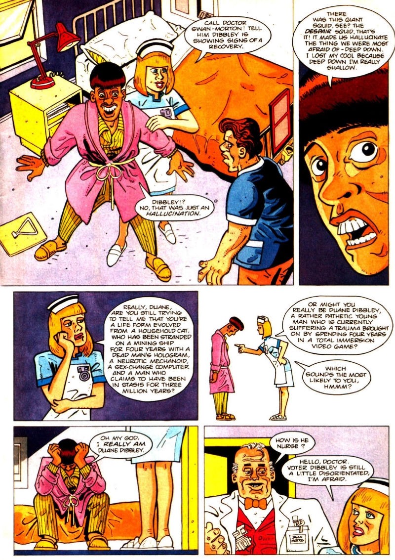 Meanwhile, the "regular crew" stories were rolling on in earnest. Famed Sonic the Comic writer/artist Nigel Kitching told a "Back to Reality" flashback sequel in issue #9 - in which the Cat temporarily believed that in fact, everything since the episode had been an hallucination after all - while in issue #11's Wetware, a virtual reality interaction with Lister saw Holly given a body, with the first order of business naturally being for the pair to go down to the pub.