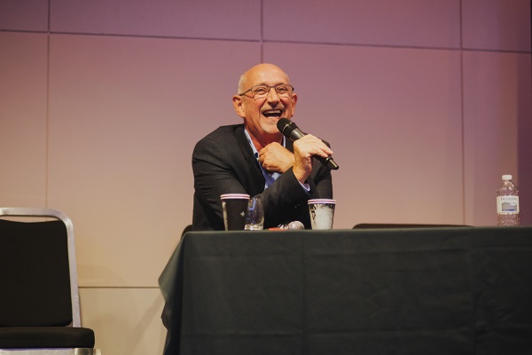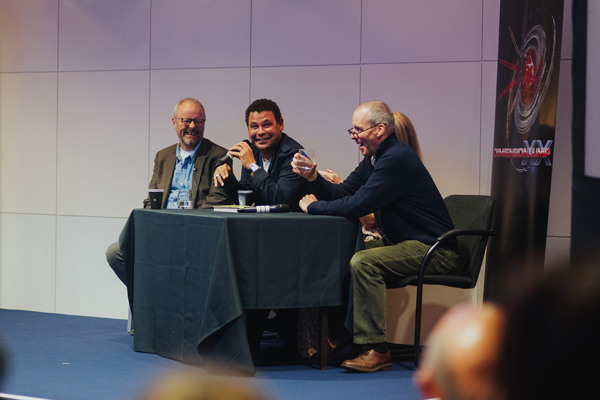 Turning over to the audience for questions, one fan begins by thanking Doug for "whatever part of your soul you've donated to Red Dwarf." "Just before you go on," replies Doug, "can I just say thanks to all you guys, and the amazing job the Fan Club have done - not just this weekend, but for years and years. Because without you, we wouldn't be able to make Red Dwarf, and we're humbled and grateful that we're still allowed to make it, and have been for the last thirty years.