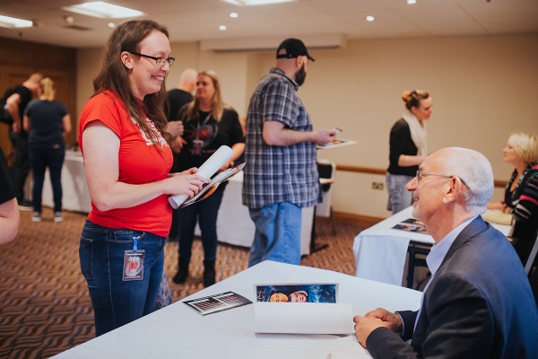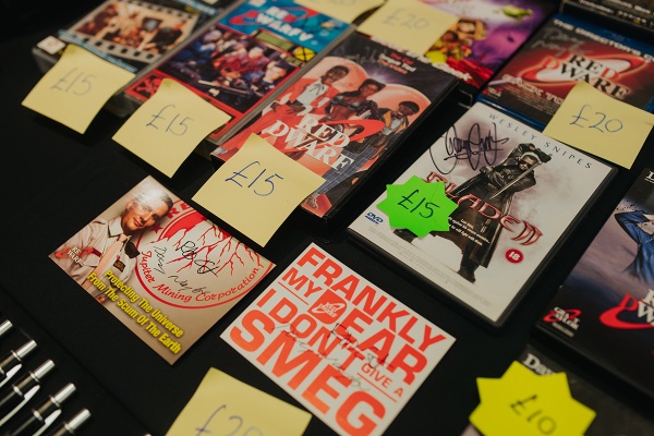 In the meantime, while we wait for the main hall events to kick off, those who aren't queuing for photos can choose to get their first look at the merchandise room - a fantastic opportunity to plug any gaps in collections, as well as visit with the actual, original screen-used Starbug brought along by Mike Tucker - or simply hang out in the hall watching videos of episodes and bonus features that play inbetween panels.