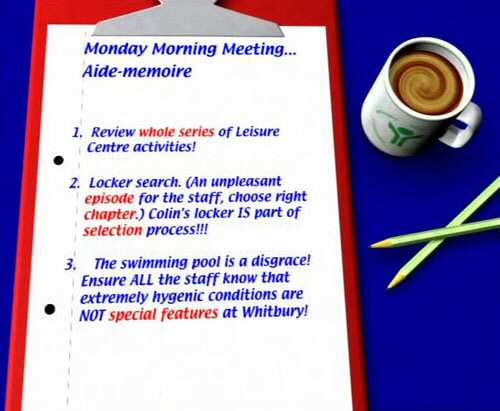 After a funky intro, including Brittas announcing the Whitbury Newtown Leisure Centre motto, CG-rendered menus take the viewer through the centre. The main menu is cunningly disguised on a clipboard in the changing room. Selecting the extras menu, meanwhile, will take the viewer out through the door and into the swimming pool!