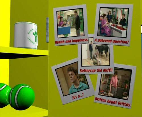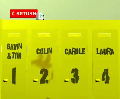 But it was the episode menu which most surprised us. Looking up, the camera glides over to the lockers. Selecting one will open the door and take the camera closer, showing Polaroids pinned up inside, each of which represents a scene. Amazingly, this is almost exactly the same concept that will feature on the Red Dwarf DVDs for Series III and IV! (Only the Brittas locker room doesn't overlook Starbug in its hangar...)