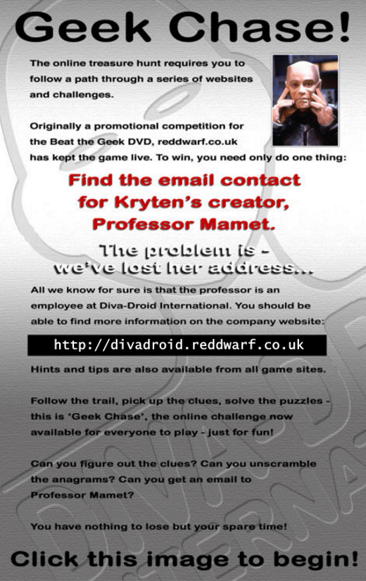 Click the flyer artwork to see the original instructions then visit http://divadroid.reddwarf.co.uk to get started. Remember, all you have to do is find Professor Mamet's email address. It really is that simple. Kinda.