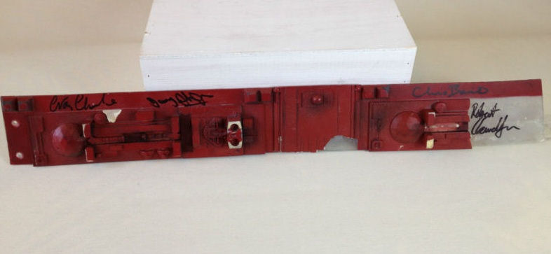 As many of you will know, the good ship Dwarf was redesigned in 1997 for the Remastered video releases (and, later, Series VIII) - but before being rendered in CGI, the design was built lovingly in hand-crafted model form. That very same model has now been chopped down and repurposed for use in Red Dwarf X - but in doing so, naturally, the production team had a fair few pieces of it left over. It's one such piece, measuring almost half a metre in length, that's now up for sale - and just in case it wasn't quite valuable enough for you, it's been signed by Craig, Chris, Robert and Danny to boot.