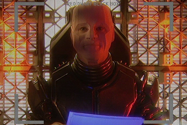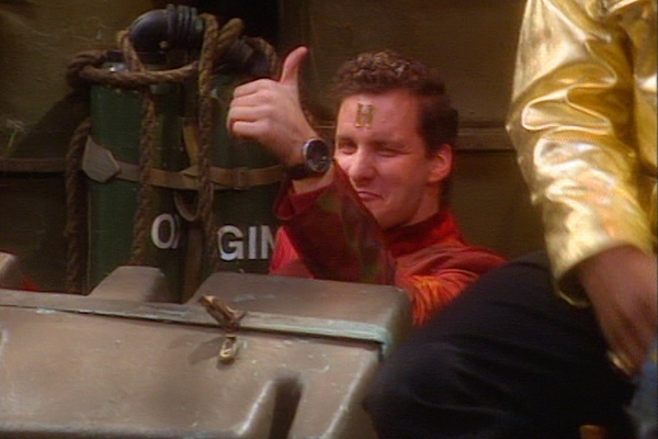 The clips were linked together by brand new footage, performed by Robert Llewellyn as Kryten and written by him and Doug - including a particularly fan-targeted section in which Kryten answered the "ten most asked questions about Red Dwarf", which were almost entirely continuity niggles. And even more excitingly, in an era before DVD special features, the tape featured the "original ending" - that is, the "urine recyc" postscript - of Series VI's Out of Time, still at that point the most recently-transmitted Red Dwarf episode!
