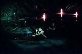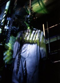 The original eight-foot Red Dwarf model had been wrecked when it fell off a shelf, so when the ship had to be blown up for series V a new, smaller model was constructed. Several new travelling shots of the five-foot miniature were filmed before it was packed with explosive charges and blown to smithereens in seconds - the high-speed film was slowed down to give the effect of a massive explosion and drifting wreckage.